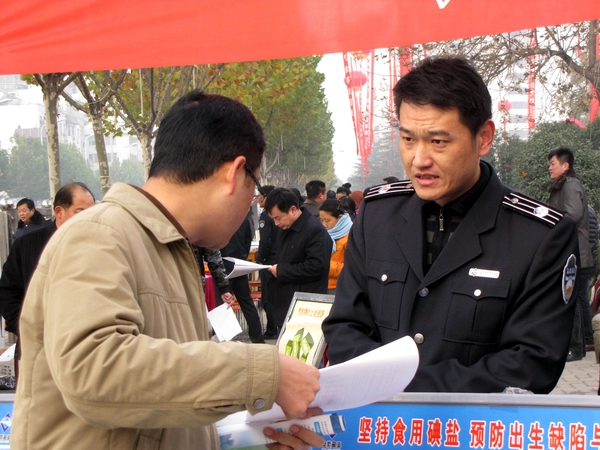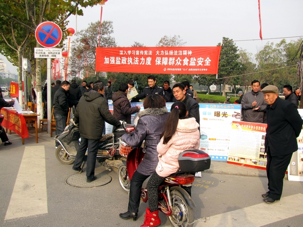 阜陽市鹽務局高度重視此次宣傳活動,結合自身業務范疇,精心準備大量法制宣傳資料。早晨7時,天氣陰冷,寒風勁吹,我局鹽政執法人員在副局長王道亞的帶領下,早早地布置好法制宣傳臺。在活動現場王道亞親自向過往群眾宣傳鹽政法律法規知識,宣傳消費者、經營者的權利和義務,宣傳消費者如何依法維權;進行了假冒偽劣食鹽展示和鑒別;開展了涉鹽咨詢、受理投訴舉報。此次宣傳共發放宣傳資料500余份,接受群眾咨詢200余人次?;顒蝇F場布置了咨詢展臺,擺放宣傳圖板10塊、宣傳展架3個、懸掛 2條生動主題橫幅,展示了近期查獲的部分劣質私鹽樣品,教市民辨別真假碘鹽的活動,咨詢臺前觀看宣傳圖版和前來咨詢的群眾絡繹不絕,受到了親自趕赴現場慰問的市人大常委副主任李新才、市政府副市長黃珍、市政協副主席張永俠、市委宣傳部、市司法局和市依法治市領導小組辦公室有關領導以及廣大群眾的一致好評。