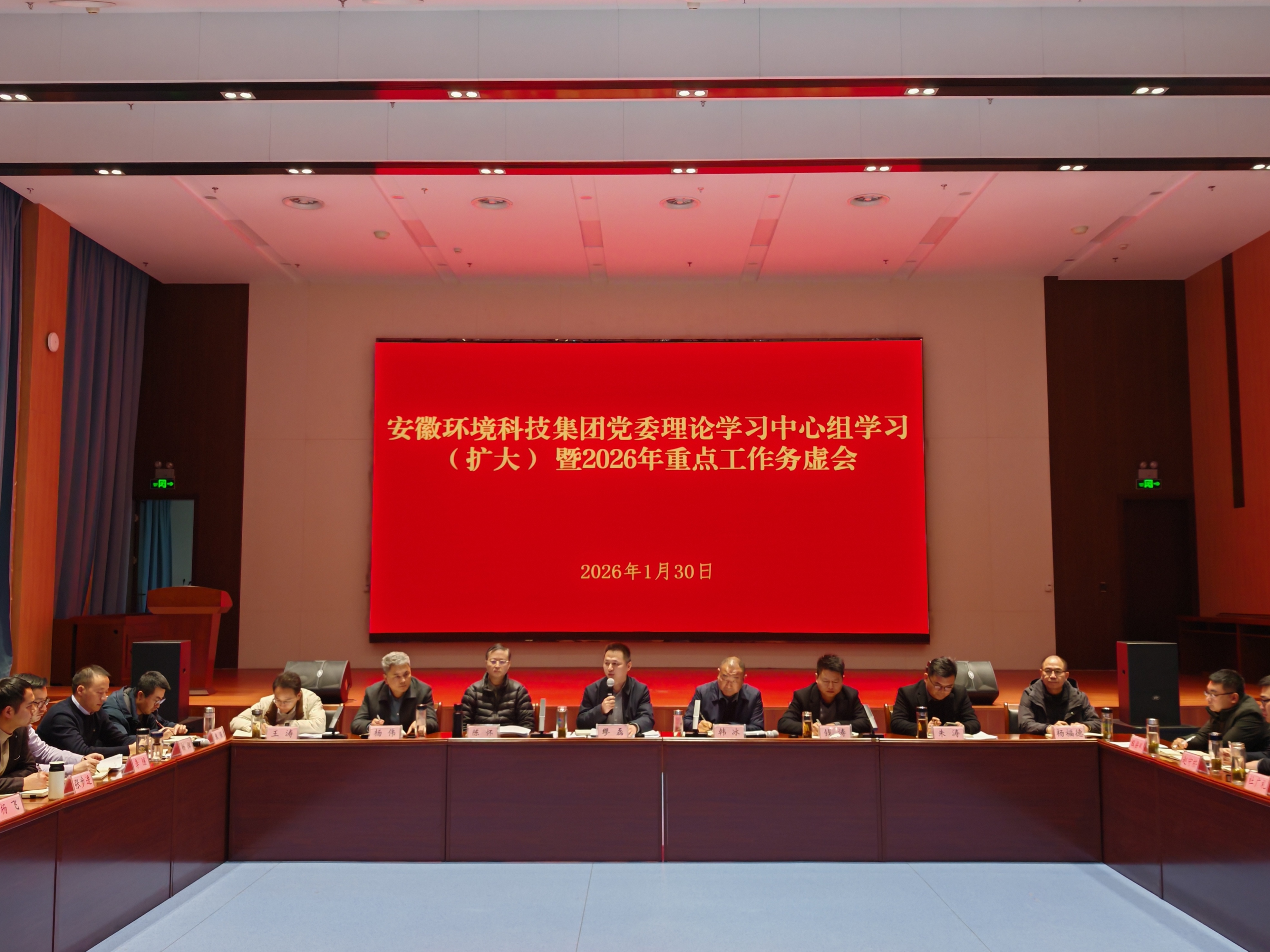 2026年1月30日,安徽環境科技集團黨委理論學習中心組學習(擴大)暨2026年度務虛會在合肥召開。會議深入學習領會黨中央及省委、省政府近期系列重要會議精神,全面分析內外部形勢,系統謀劃2026年發展藍圖,統一思想、凝聚共識,為在新起點上推動公司轉型發展、實現華麗轉身擘畫了清晰路徑。集團黨委書記、董事長繆磊出席會議并講話,黨委副書記、總經理韓冰作年度形勢任務分析報告。集團領導班子成員、總經理助理、首席研究員、各部門負責人、各子(項目)公司負責人參加會議。